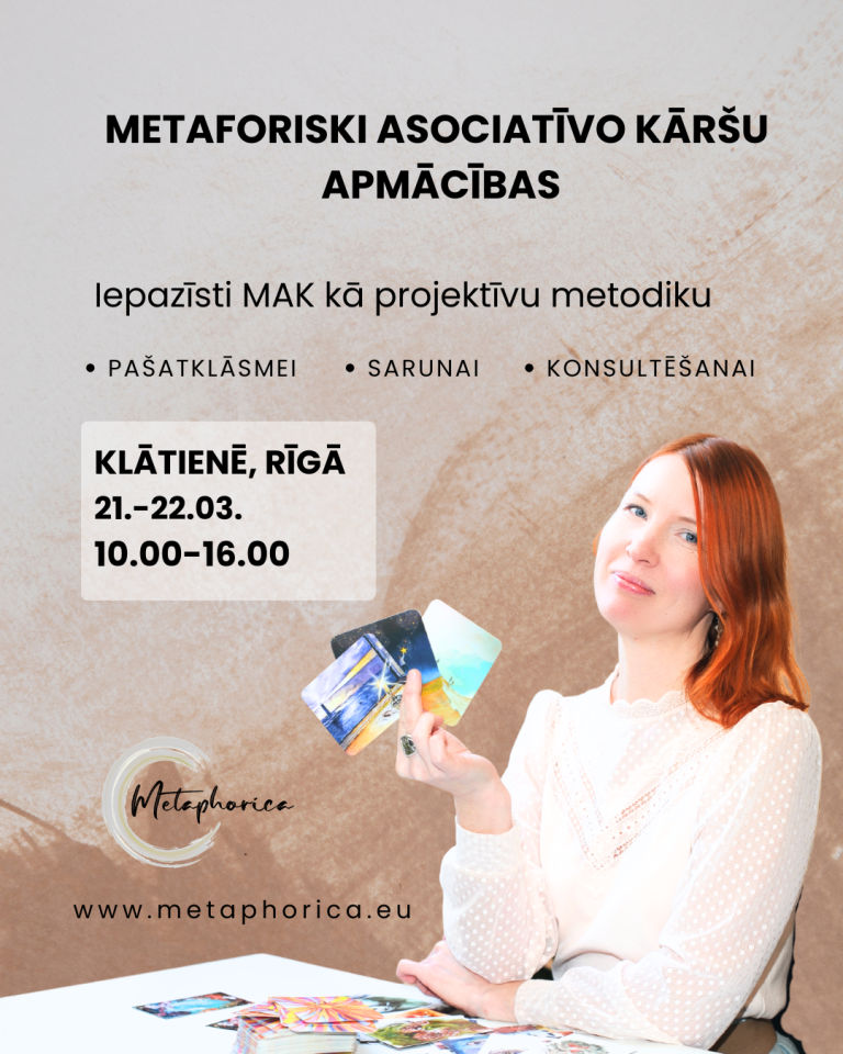 Praktisks, dzīvs divu dienu apmācību kurss, kurā apgūsi metaforisko kāršu lietošanas pamatprincipus, lai varētu tās izmantot darbā ar sevi, sarunā ar otru un grupās.